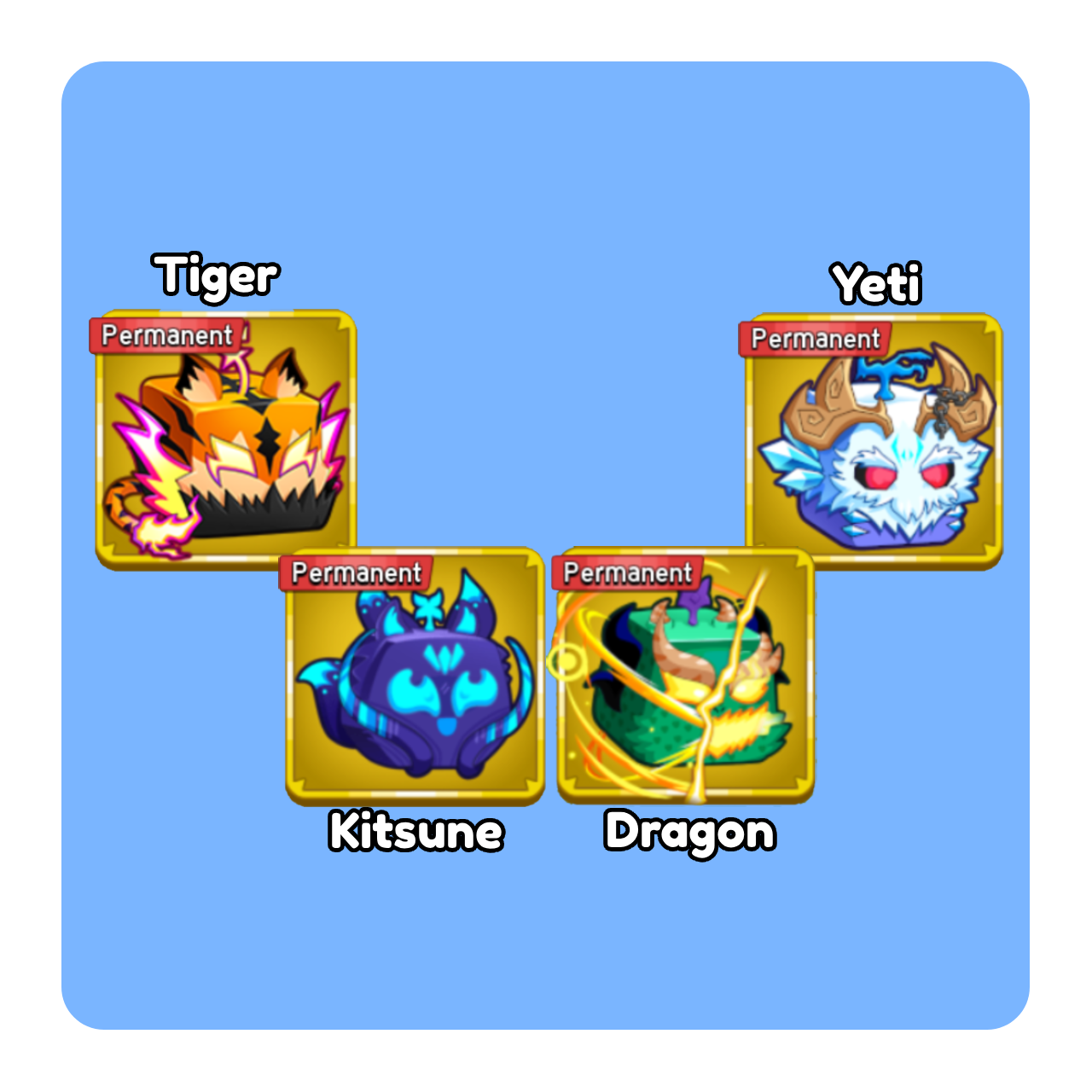 Pack includes: • Permanent Dragon • Permanent Kitsune • Permanent Yeti • Permanent Tiger